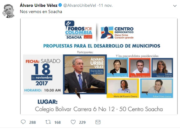 El expresidente y senador Álvaro Uribe Vélez anunció en su cuenta de Twitter su visita al municipio de Soacha el próximo 18 de noviembre.