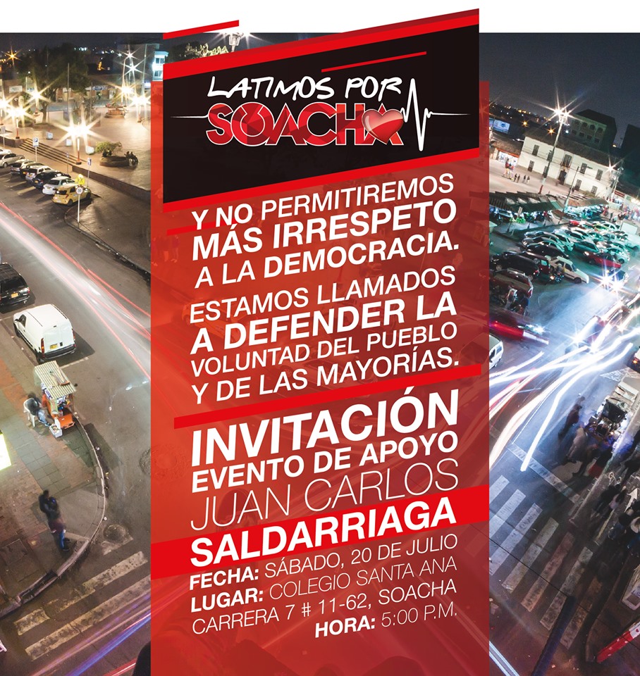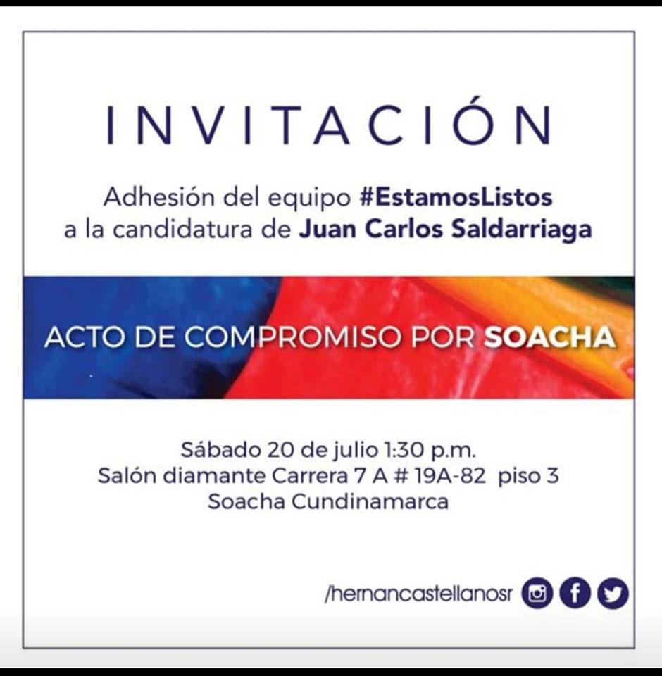 Agradezco la confianza que deposita en mí el Partido de la U al otorgarme el aval a la Alcaldía de Soacha para seguir trabajando por un cambio para los soachunos. Juntos, hombro a hombro y con la bendición de Dios vamos a lograrlo el próximo 27 de octubre”, publicó Saldarriaga.