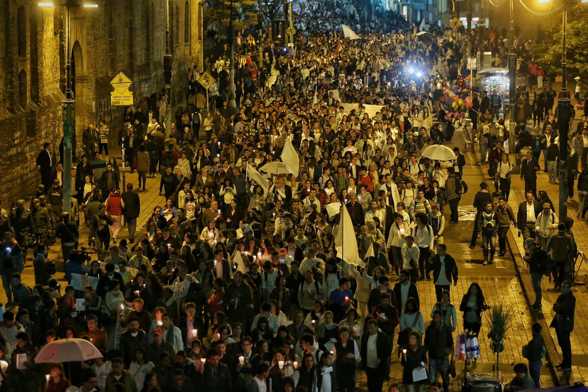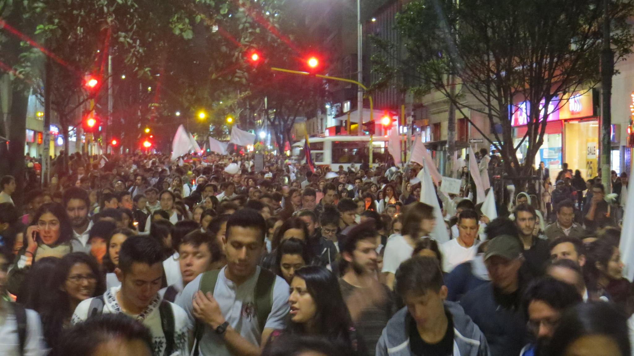 La manifestación de jóvenes de 26 universidades de Bogotá tomó forma sobre las 6:00 de la tarde, cuando miles de personas se reunieron en el centro de la ciudad, iniciando un recorrido desde el Planetario Distrital hasta la Plaza de Bolívar, convirtiendo la carrera Séptima en una gran marcha humana, adornada con la luz de las velas y antorchas que algunos asistentes portaban en sus manos.