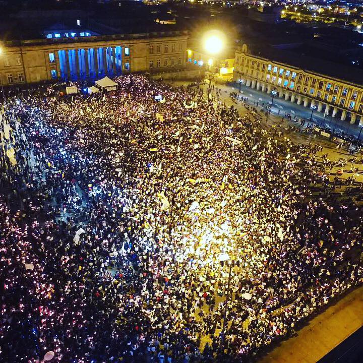 Hacia las 7:30 de la noche la Plaza de Bolívar estaba totalmente colmada de manifestantes, hubo un minuto de silencio en memoria de los muertos del conflicto, y luego de manera conmovedora se entonó el himno nacional.