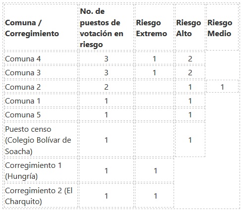 • 2 puestos de votación se encuentran en riesgo extremo, 4 en riesgo alto y 7 puestos en riesgo medio.