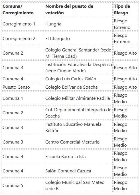 De acuerdo con la Misión de Observación Electoral MOE Regional Bogotá, para estas elecciones existen 13 puestos de votación en el municipio de Soacha con atipicidades en su comportamiento electoral y que podrían dar indicios de posible manipulación indebida de tarjetones, compra o venta de votos. Este es el primer mapa de riesgos detallando comunas y puestos de votación que se realiza sobre las elecciones locales en el municipio.