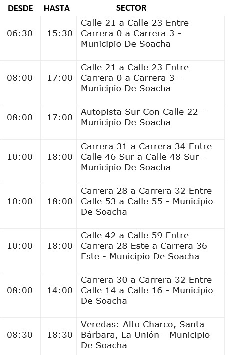 La empresa Enel-Codensa anunció cortes de luz para este miércoles 18 de diciembre de 2019 en algunos barrios de Soacha.