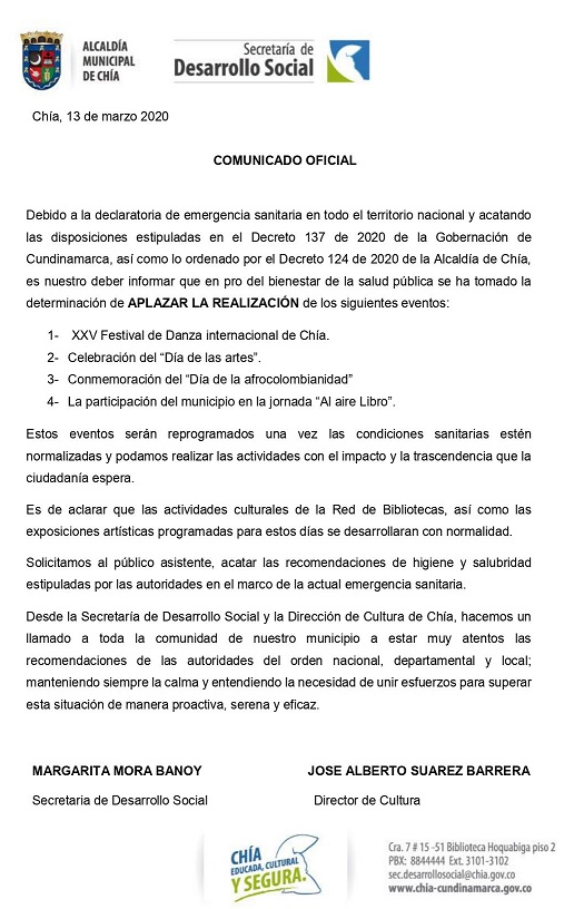 En el municipio de Chía se suspendieron indefinidamente las actividades culturales programadas e invitaron a la comunidad a cumplir las recomendaciones de prevención e higiene.