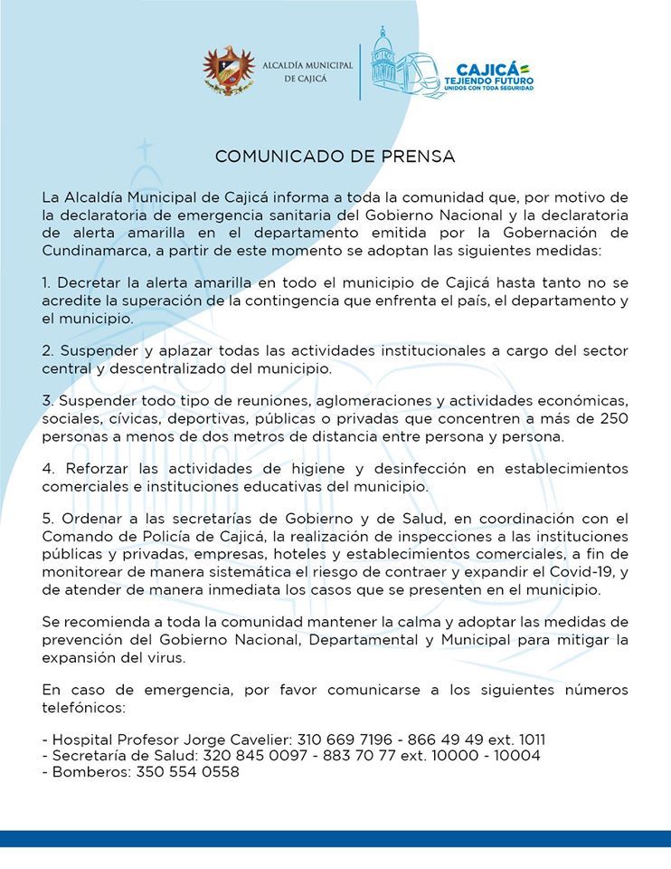 Las Administraciones de estos dos municipios, tomaron esta decisión teniendo en cuenta la declaratoria de emergencia sanitaria en todo el territorio nacional y acatando las disposiciones estipuladas en el Decreto 137 de 2020 de la Gobernación de Cundinamarca.