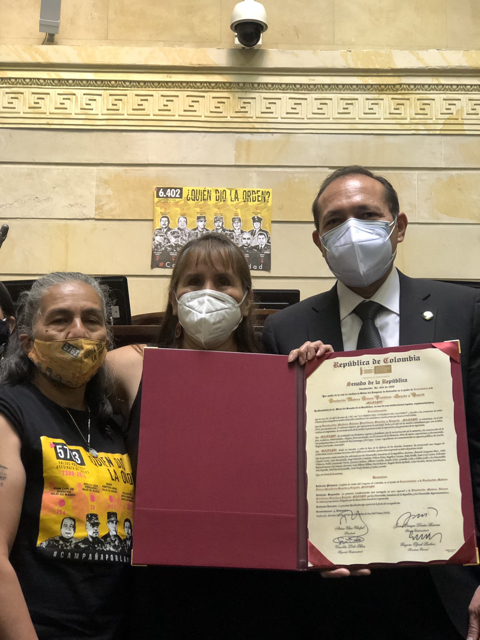 Al hacer entrega de la condecoración, el senador Antonio Sanguino de la Alianza Verde, manifestó, “el mejor día de la mujer es reconocer su lucha por sus derechos, es reconocer a quienes juegan un papel de liderazgo en la búsqueda de la paz, una de esas luchas la hacen estas madres de los mal llamados falsos positivos”.