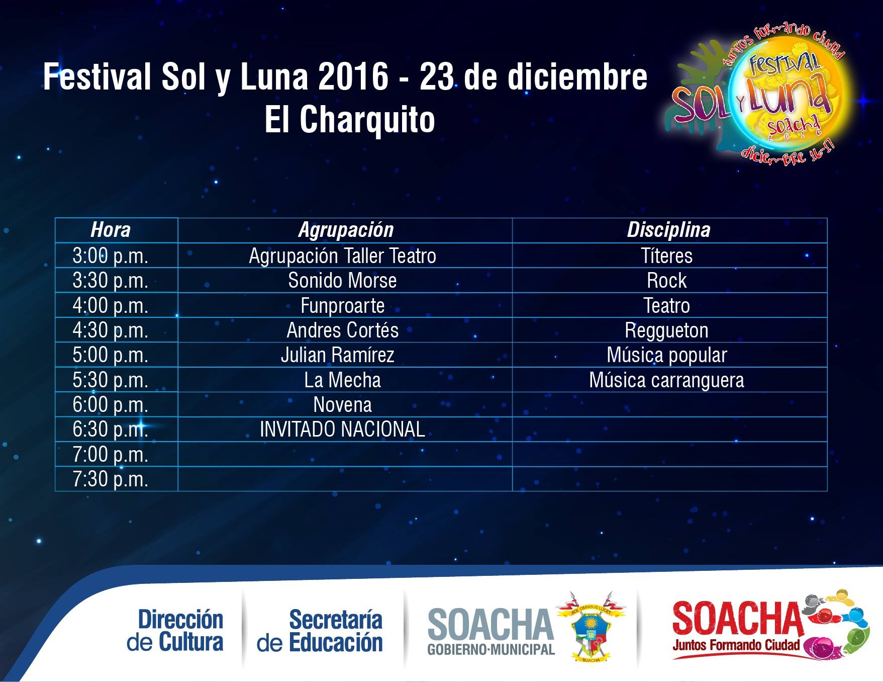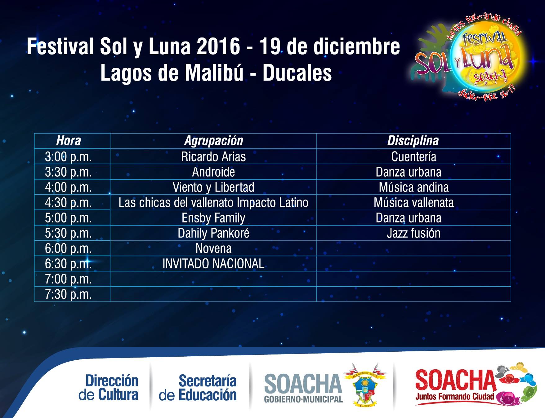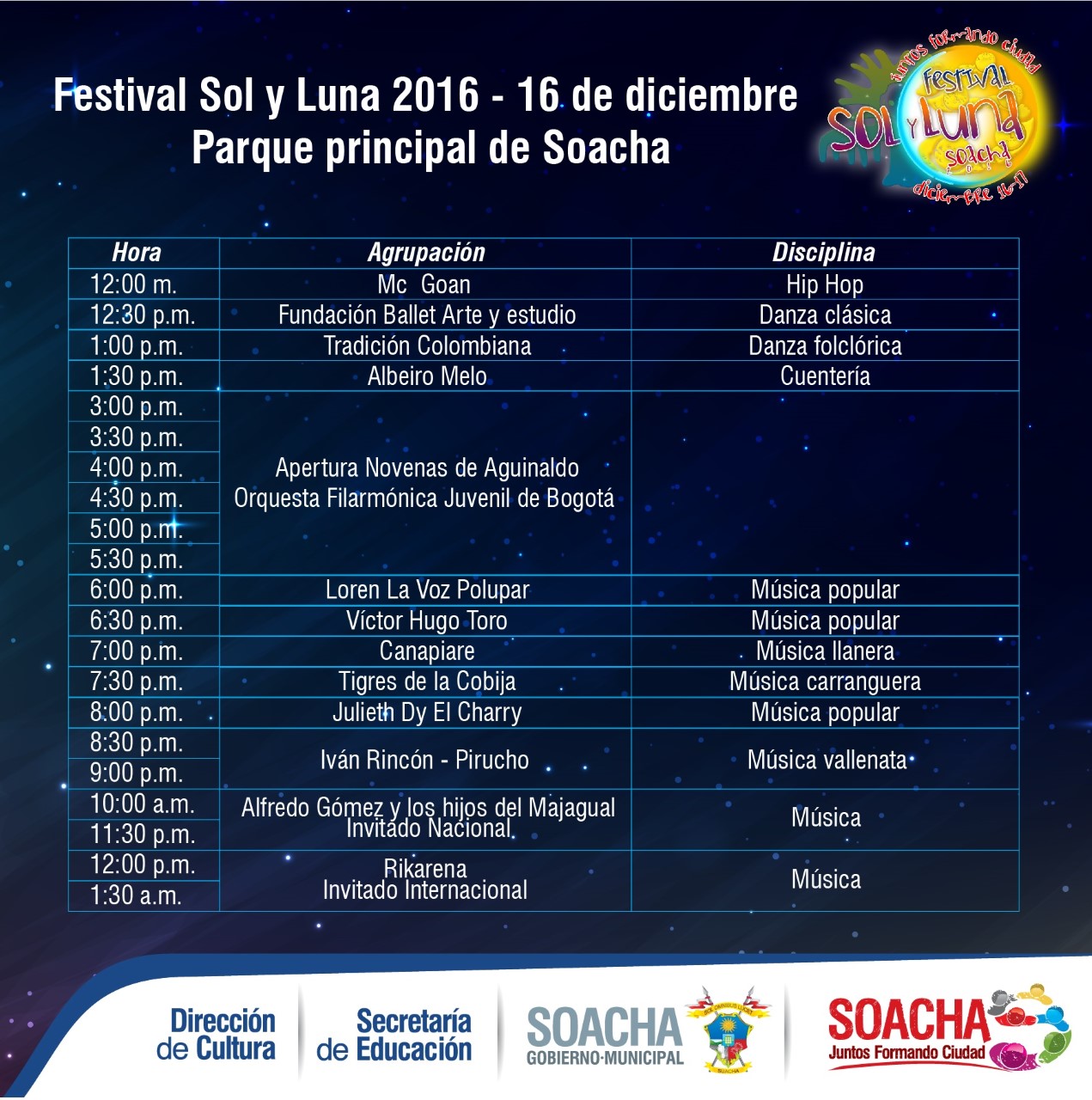 La Dirección de Cultura de Soacha realizará los días 16, 17, 19 y 23 de diciembre una nueva versión del Festival de Sol y Luna, el cual contará con la presentación de artistas internacionales como la orquesta Rikarena, en lo que se espera sea un gran espectáculo para esta época decembrina.