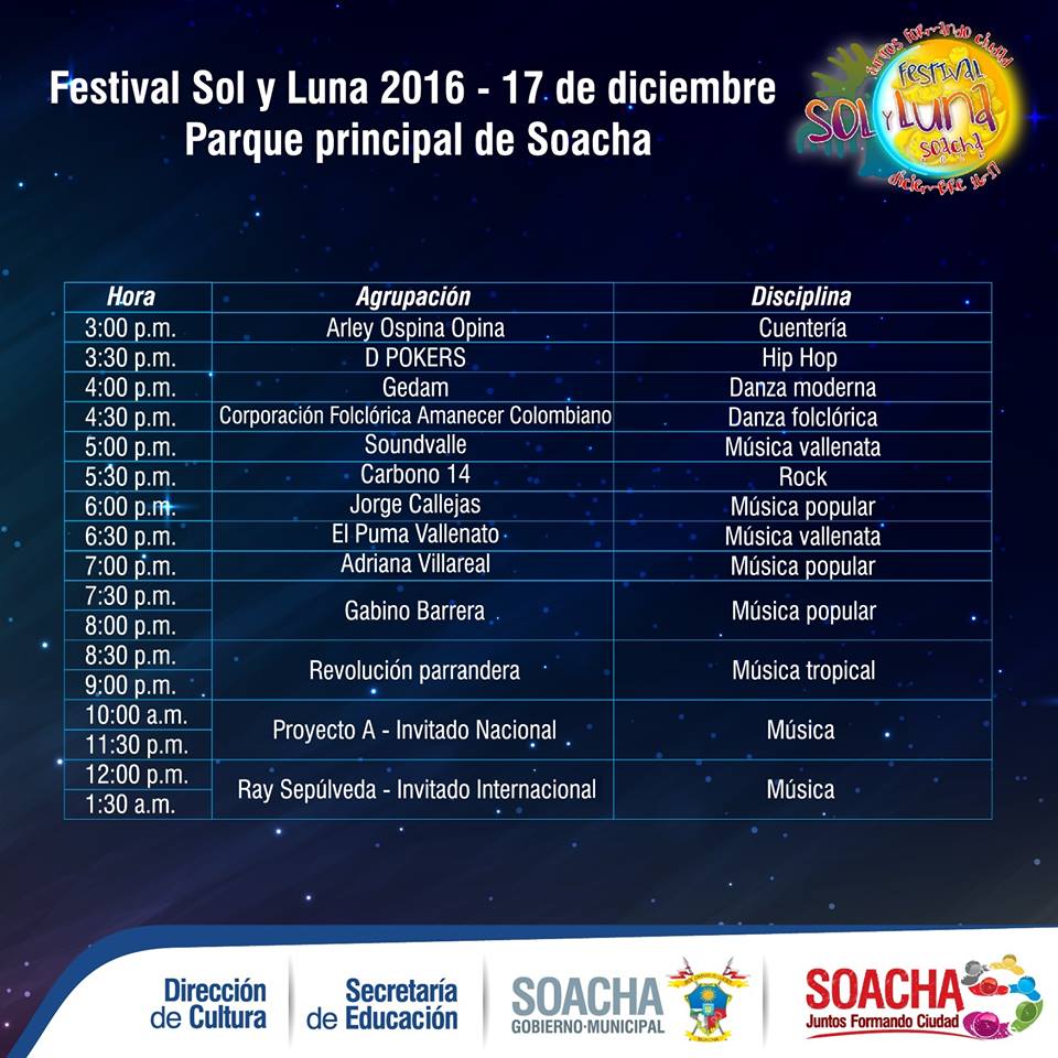 El sábado 17 de diciembre la gran fiesta de los “soachunos” comenzará a partir de las 3:00 p.m., para este día se tiene programado la presentación de los artistas más representativos del municipio como son los grupos de danza Gedam, la Corporación Folclórica Amanecer Colombiano y el grupo de rock Carbono 14. Al filo de la media noche Proyecto A y el artista salsero, Ray Sepúlveda estarán cerrando el Festival Sol y Luna en la tarima del Parque principal.