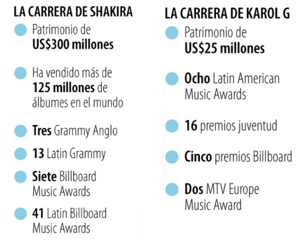 ‘La bichota’ tiene una carrera más corta, pero con importantes logros, pues ya acumula un patrimonio de US$25 millones, según datos de ‘Celebrity Net Worth’, y acumula 16 premios ‘Juventud’, cinco ‘Billboard’ y dos ‘MTV Europe Music Awards’. Rompió, además, cinco Guinness récords en el último álbum ‘Mañana será bonito’.