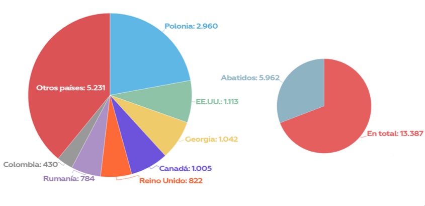 Entre los países de origen de los mercenarios figuran Polonia (2.960), EE.UU. (1.113), Georgia (1.042), Canadá (1.005), el Reino Unido (822), Rumanía (784) y Colombia (430). Polonia también ocupa el primer lugar en cantidad de pérdidas: 1.497 personas.