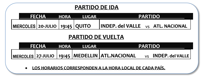 El primer duelo será en la ciudad de Quito, el miércoles 20 de julio a las 7:45 locales, mientras que la revancha será el miércoles 27 de julio, en la Ciudad de Medellín, a las 7:45 locales.