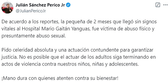 “Lamento y me llena de rabia y dolor lo ocurrido a una pequeña de tan solo dos meses en nuestra ciudad. Nunca, aquí, ni en ningún lugar del mundo debería ocurrir un hecho tan atroz como este”, indicó el alcalde.