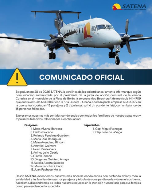 Según el reporte oficial de Satena, este es el listado completo de pasajeros y tripulantes fallecidos en el vuelo NSE 8849: