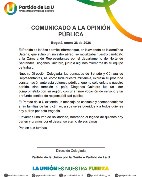 El Partido de la U confirmó el fallecimiento de Quintero y lamentó su muerte, destacando su “vocación de servicio y compromiso con la región”.