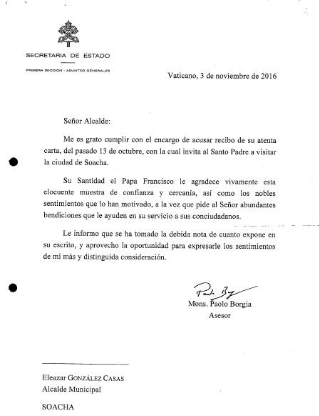 Asimismo, detalla que la Secretaría de Estado del Vaticano ha tomado la debida nota de lo expuesto en la carta radicada por el mandatario municipal la cual será puesta en consideración.